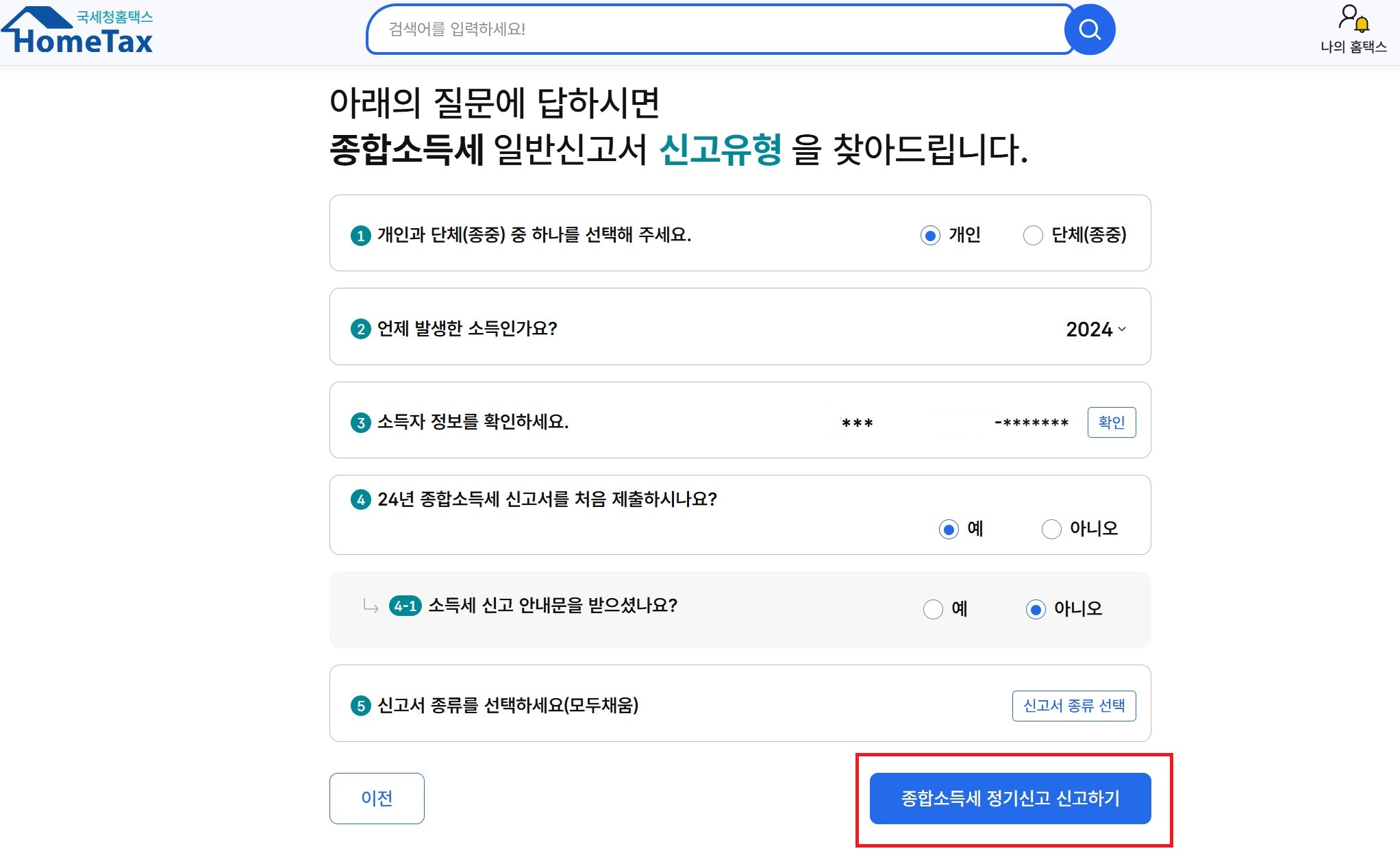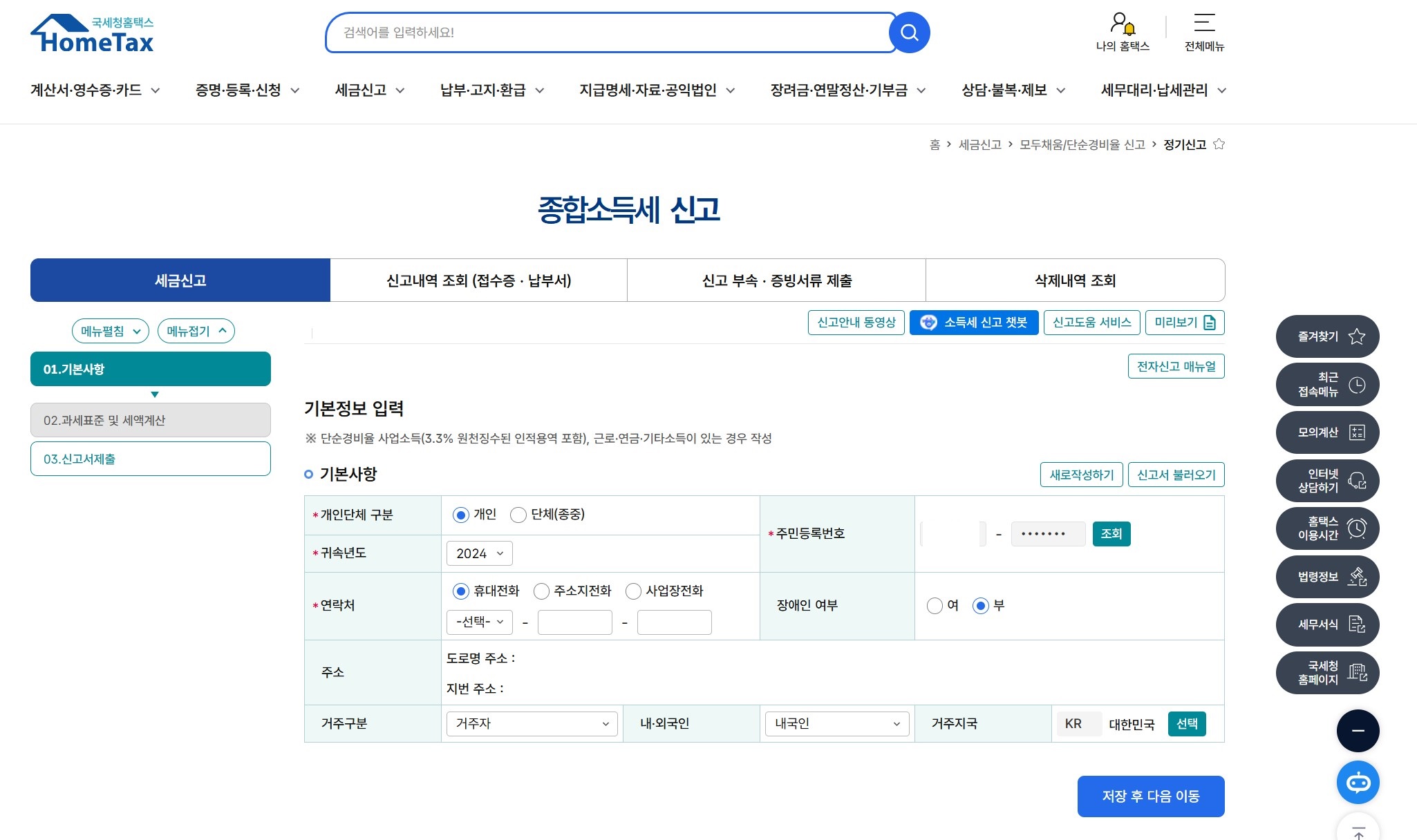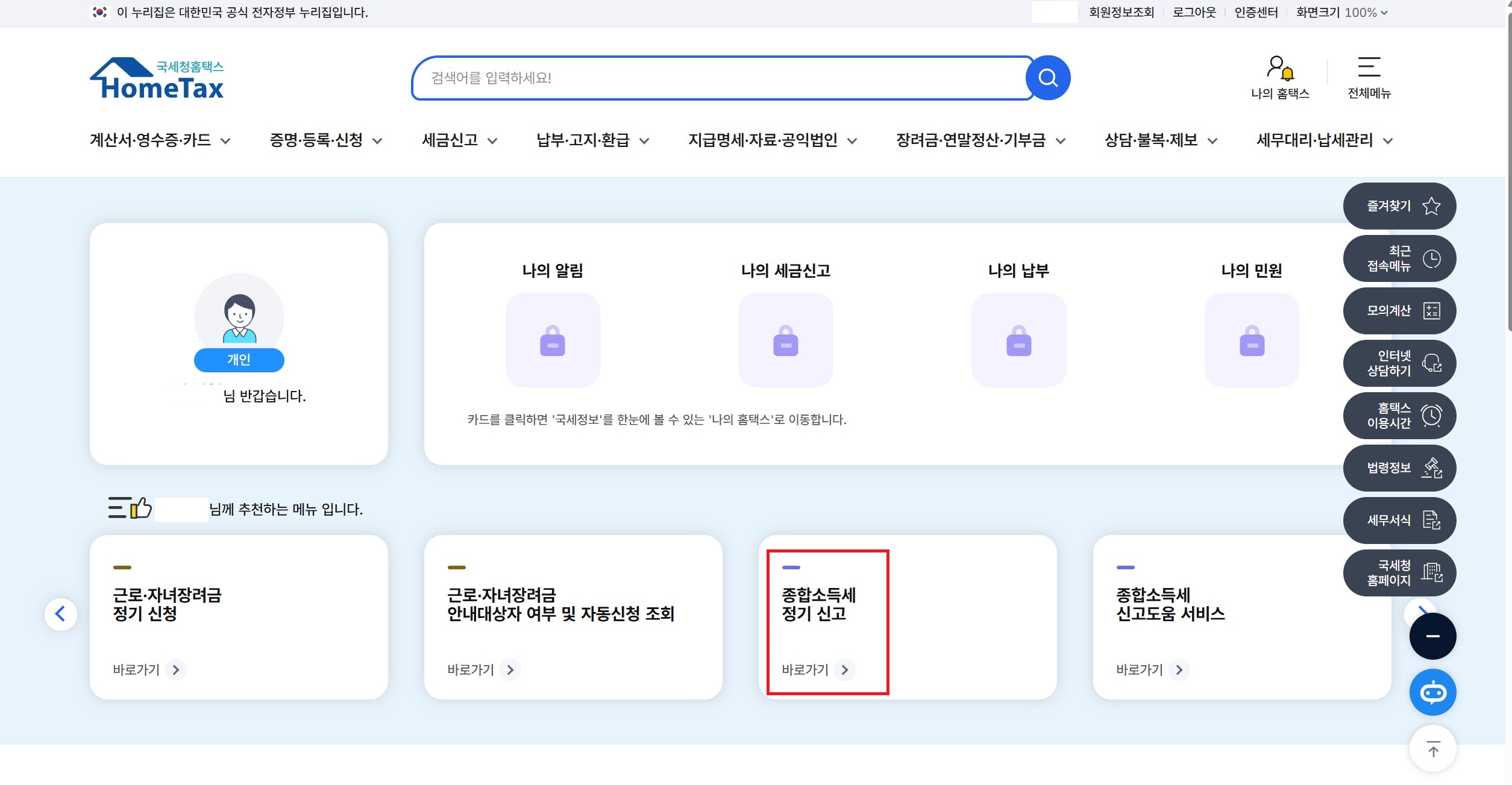 종합소득세 정기 신고 바로가기 클릭