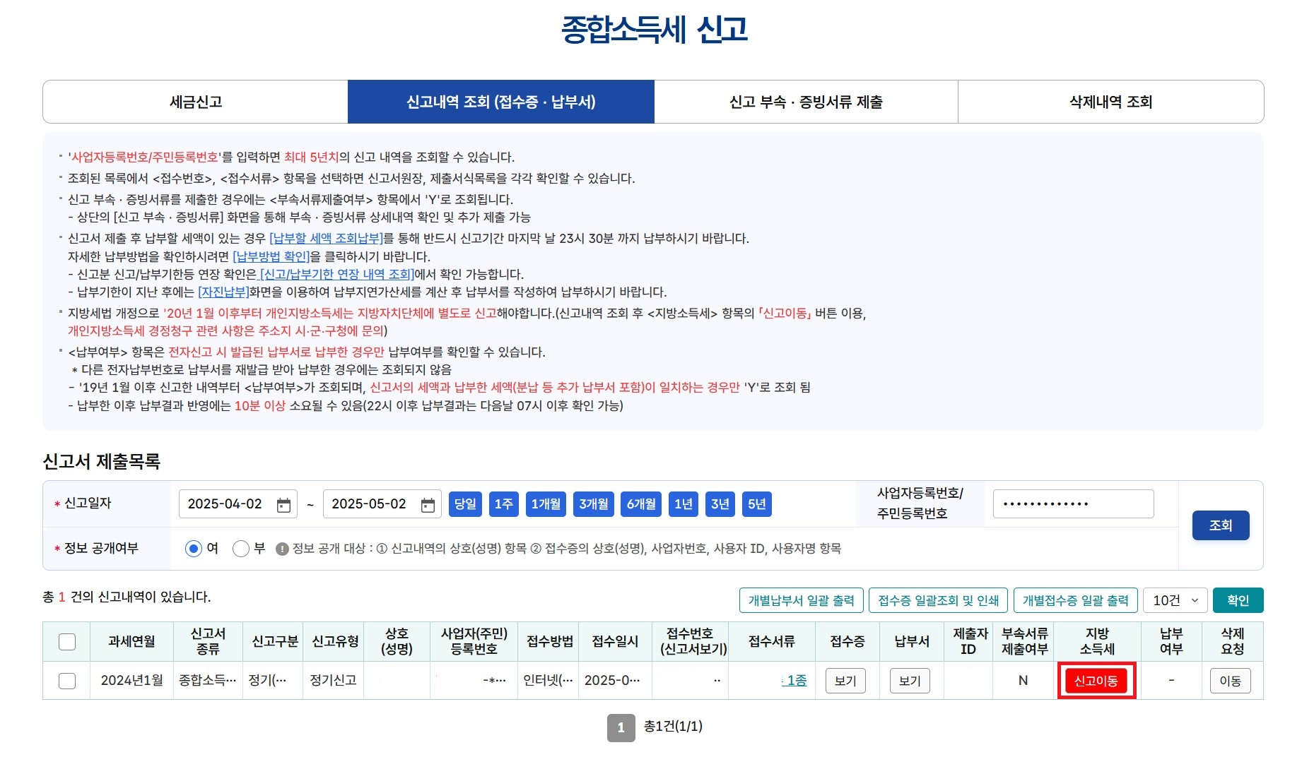 신고를 완료하면 아래 이미지처럼 신고내역을 조회할 수 있습니다.