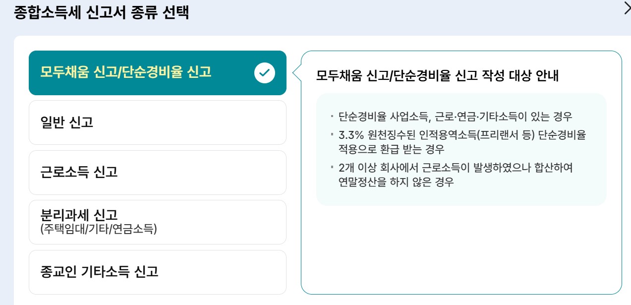 근로소득 외 추가 소득이 있는 경우는 위 이미지처럼 모두채움 신고 를 선택하면 됩니다.