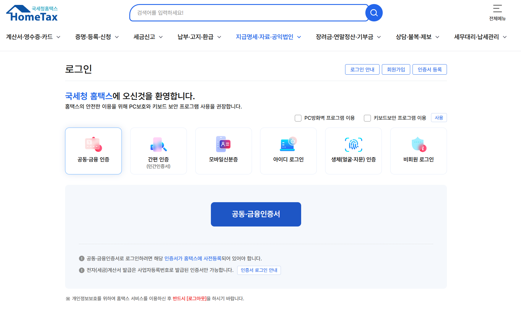 홈택스 종합소득세 신고 서비스 & 간편로그인 화면