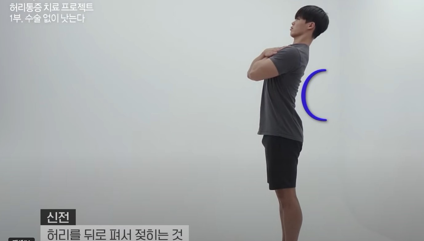 요추 전만이란 허리의 곡선을 'C자 형태'로 유지하는 것으로, 허리를 뒤로 젖힌 상태를 의미합니다. 이 자세를 유지하면 수핵이 앞으로 밀리면서 찢어진 섬유륜이 잘 붙게 됩니다.